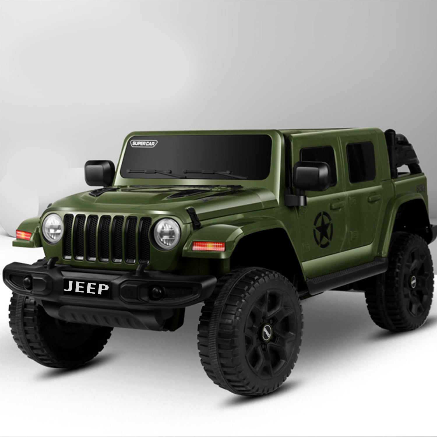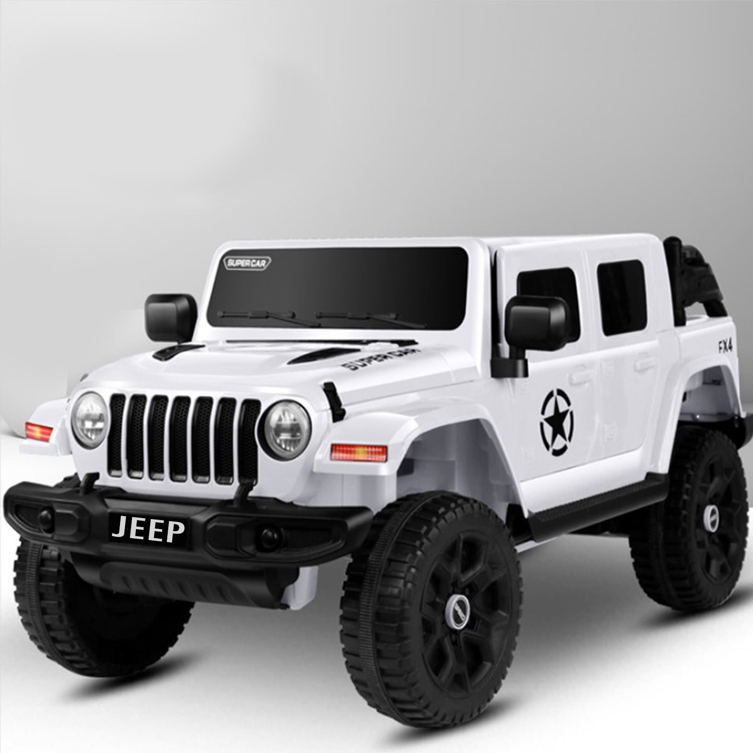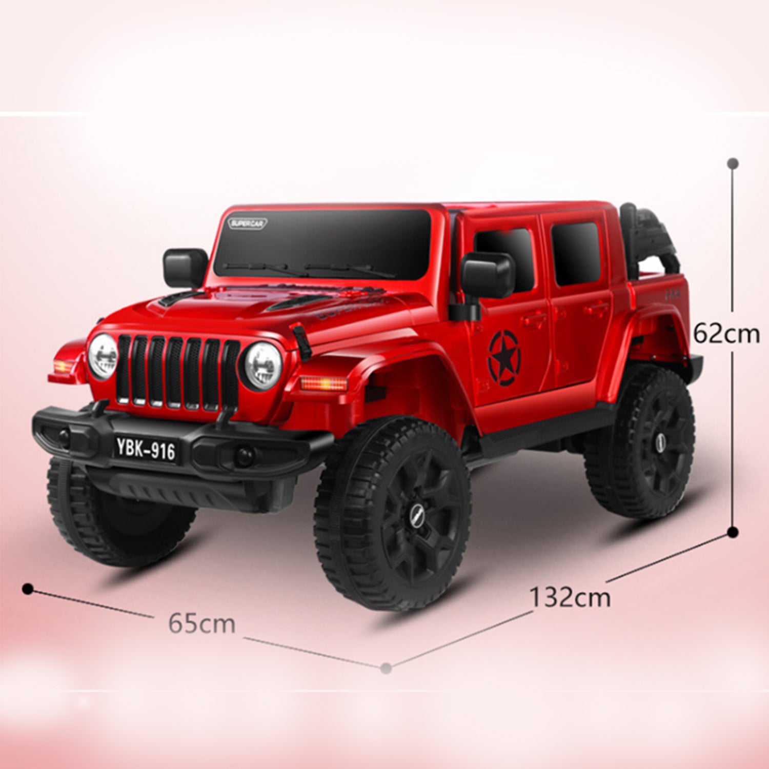 Battery jeep for kids. Easy to drive, This Ride On jeep simple for your child to driveunder adult supervision or for the parents to operate by remote control; 2.4G R/C . Has advanced slow start with LED headlights and rear lights; advanced aerodynamics, a super cool reverse winged door-opening style, exciting car sound effects, forward/backward movement, hi/low speed, Hi-Fi Dashboard for extra style and flair that your child will love.Function: