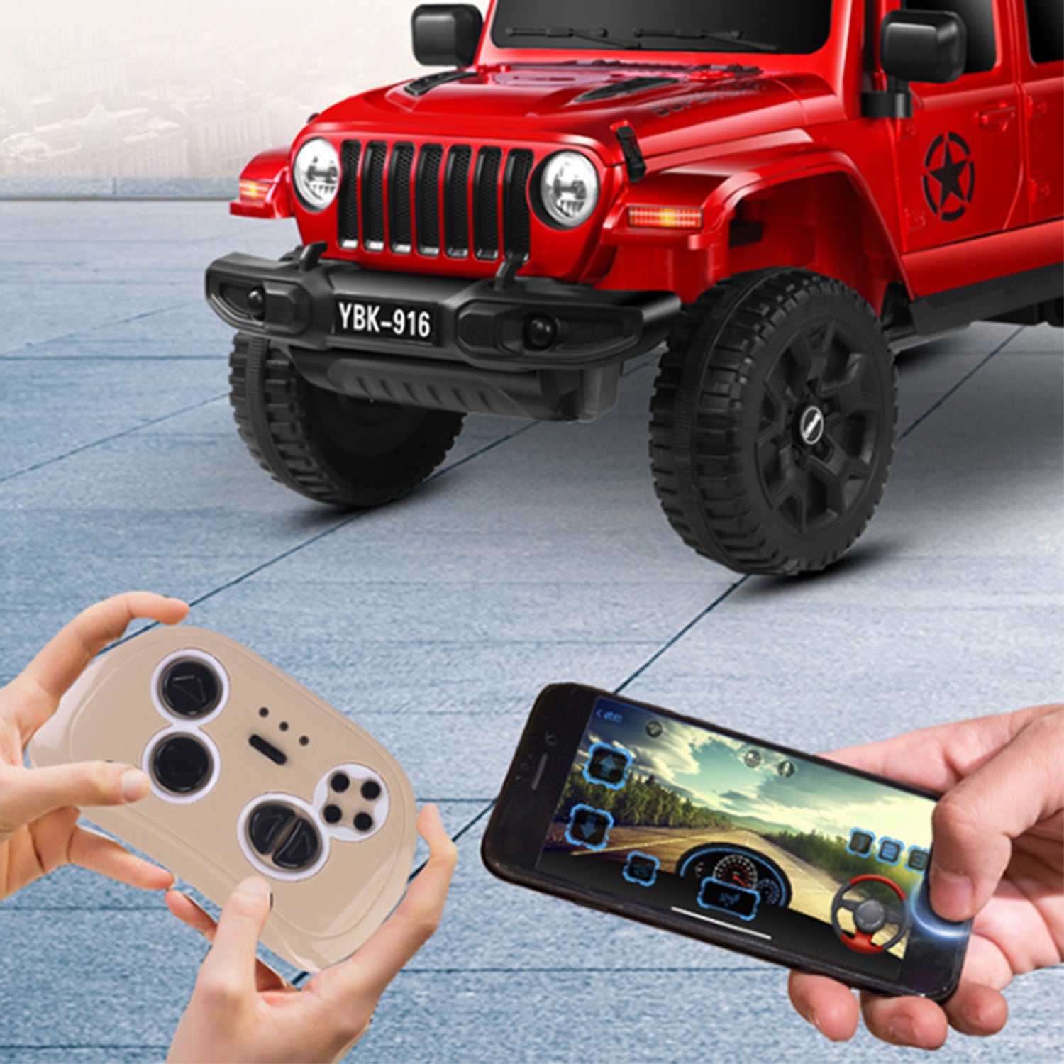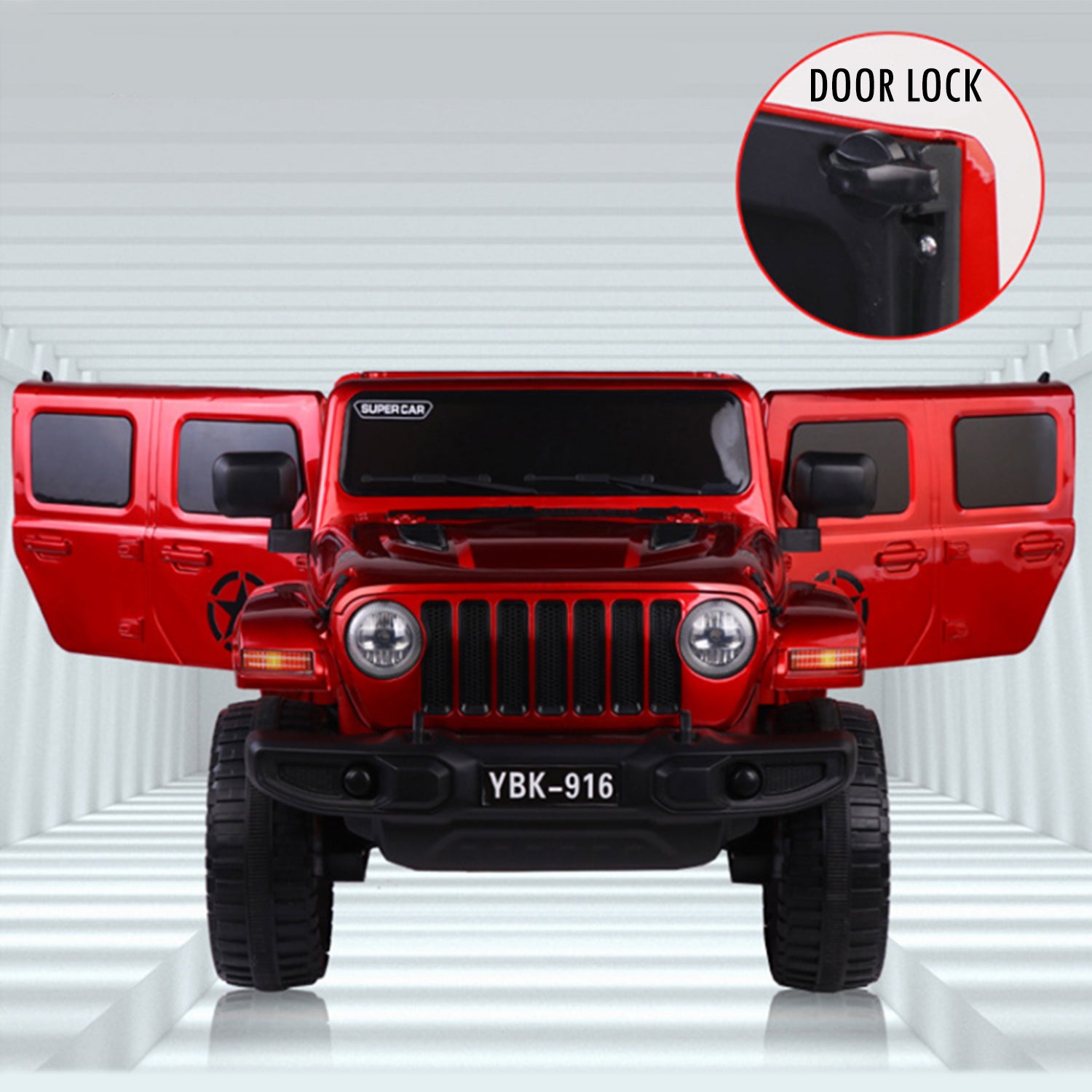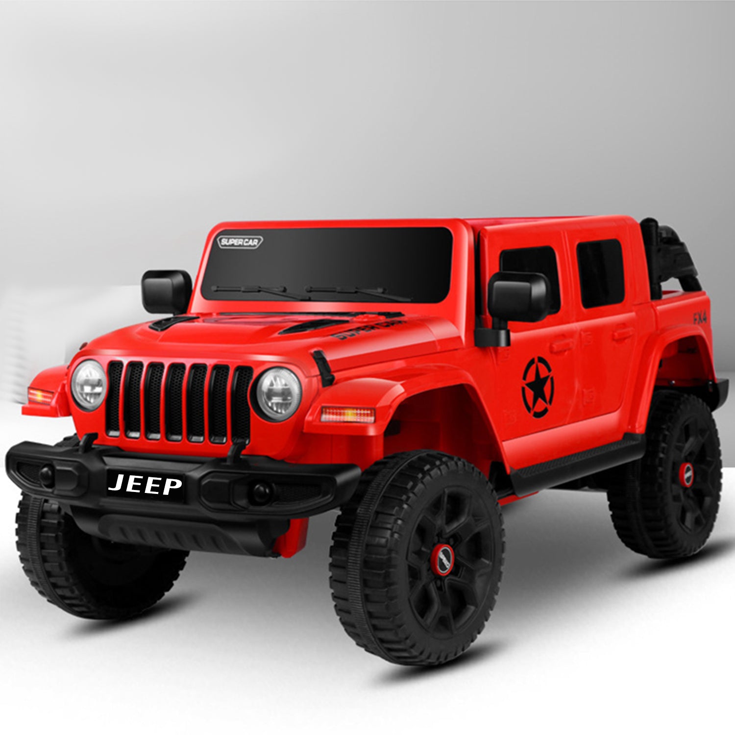 Battery jeep for kids. Easy to drive, This Ride On jeep simple for your child to driveunder adult supervision or for the parents to operate by remote control; 2.4G R/C . Has advanced slow start with LED headlights and rear lights; advanced aerodynamics, a super cool reverse winged door-opening style, exciting car sound effects, forward/backward movement, hi/low speed, Hi-Fi Dashboard for extra style and flair that your child will love.Function: