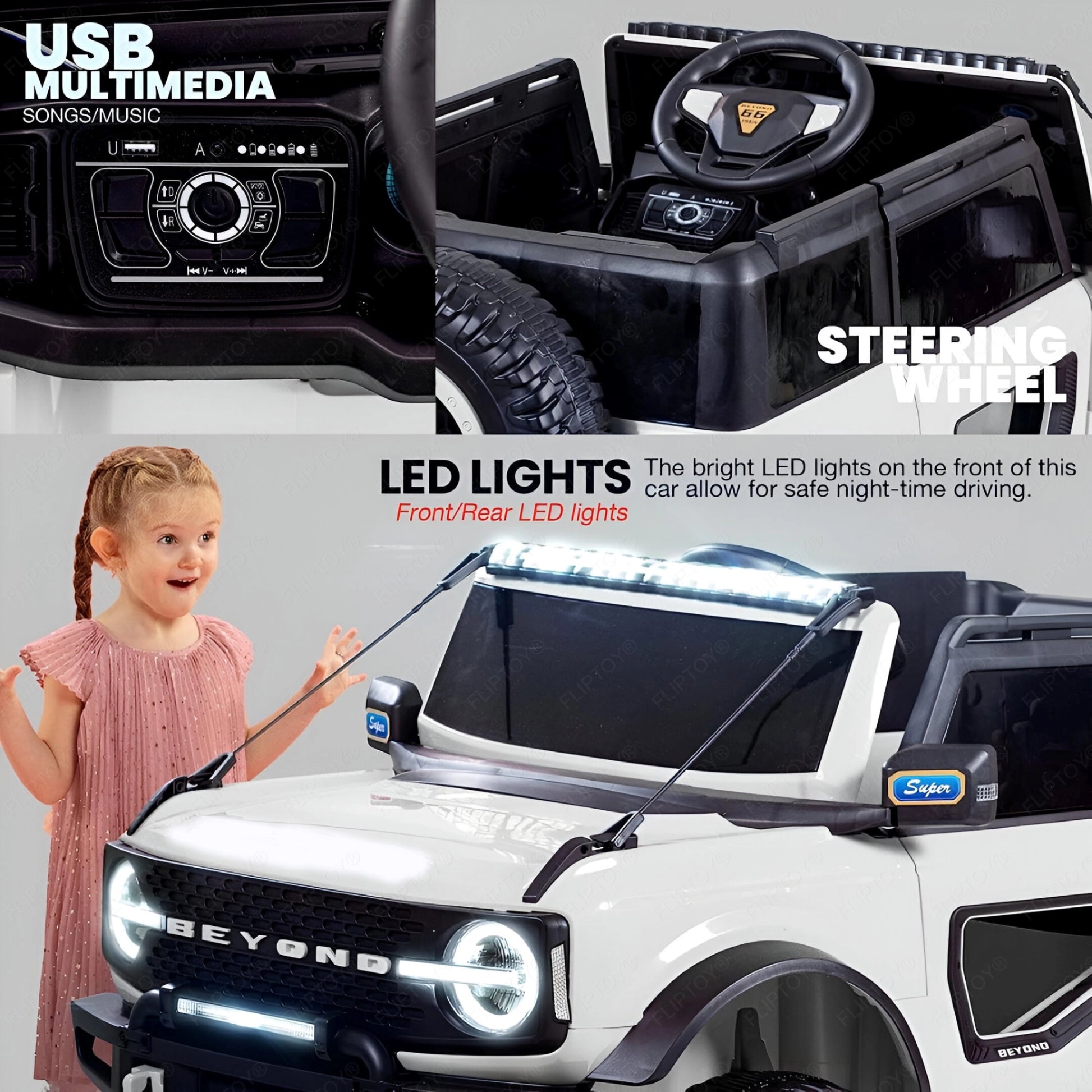 In summary, a 12-volt battery-operated baby ride-on jeep with LED headlights, inbuilt music, USB, Aux ports, and a remote controller is the ultimate gift for your child. It's not just a toy; it's a source of adventure, entertainment, and education. Watch your child's eyes light up with joy as they explore their world in style and safety with their very own ride-on jeep.Frequently Asked Questions