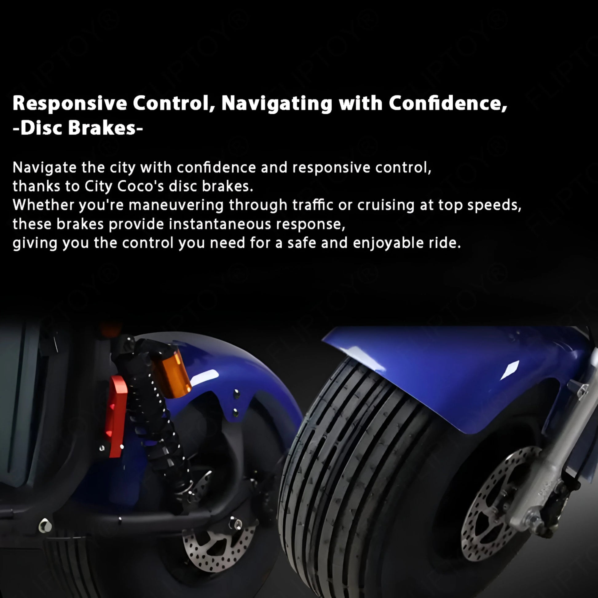 Experience the next level of safety with the City Coco Electric Scooter's responsive front disc brakes. Engineered for precision, these brakes provide immediate stopping power, giving you the confidence to navigate through city streets with ease and enhanced safety.