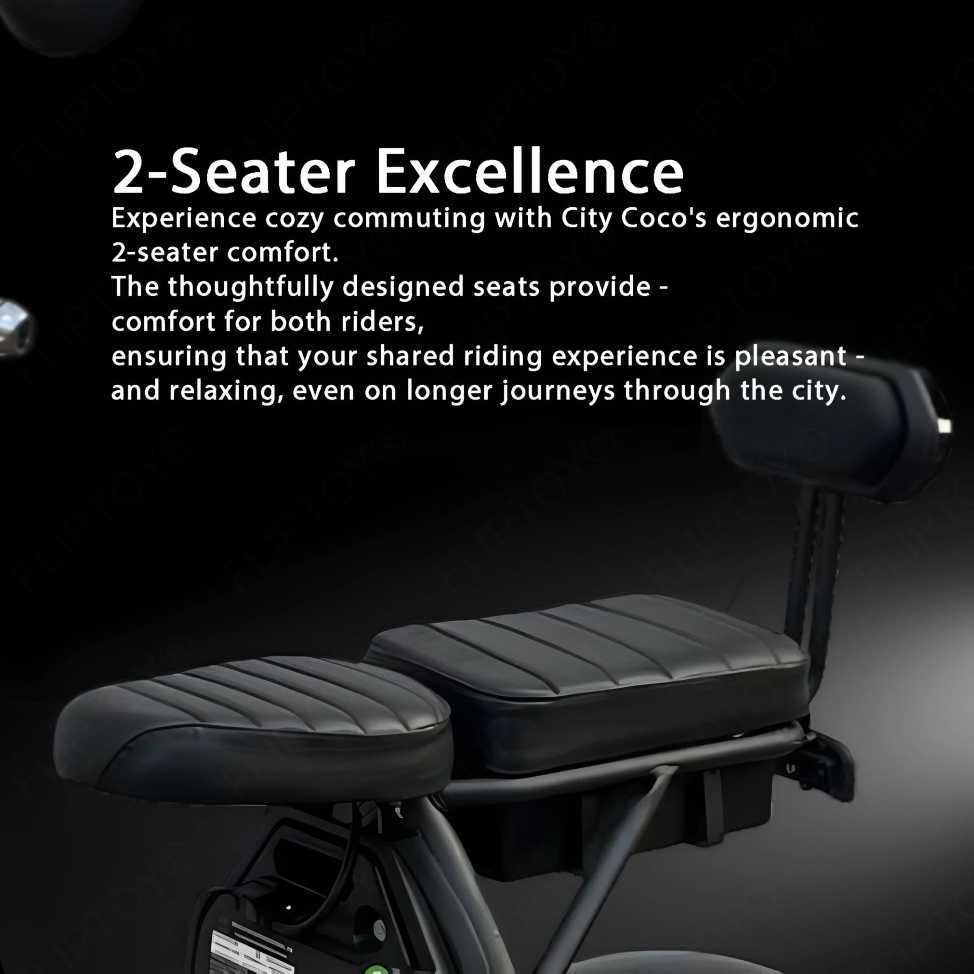 Say goodbye to solo rides – our 2-seater City Coco Electric Scooter is your ticket to effortless commuting and the creation of endless memories. Glide through the urban landscape with a companion, enjoying the freedom of the open road while forging bonds that will last a lifetime.