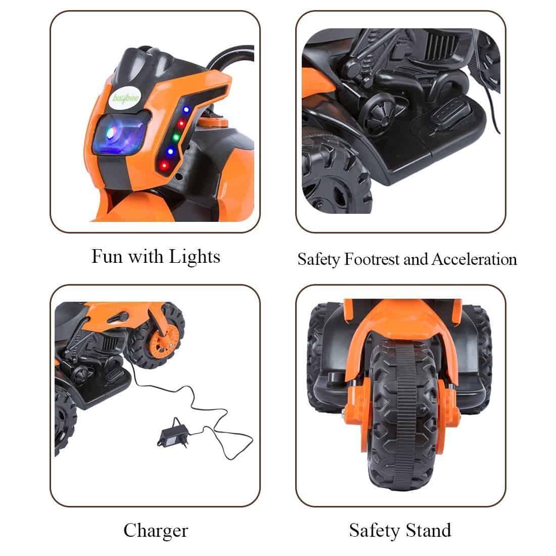 Minimum Age ( years ) : 2 years ( maximum 4 years) Iteam Feature : LED Light and External MP3 device connectivityr Battery : 6V - 4.5AH 6V 4AH x 1 Battery, Charger - 6V 500mA(Charging time 8-10 hours, Running time 2 to 2.5 hours.) EASY TO RIDE : Your baby can operate this motorcycle easily by himself/herself by foot pedal for acceleration. All you need is a smooth, flat surface to have your kids on- the-go! The 3-wheel designed motorcycle is smooth and simple to ride for your toddler or young children. Weight Capacity : 20 KgKeep shopping for