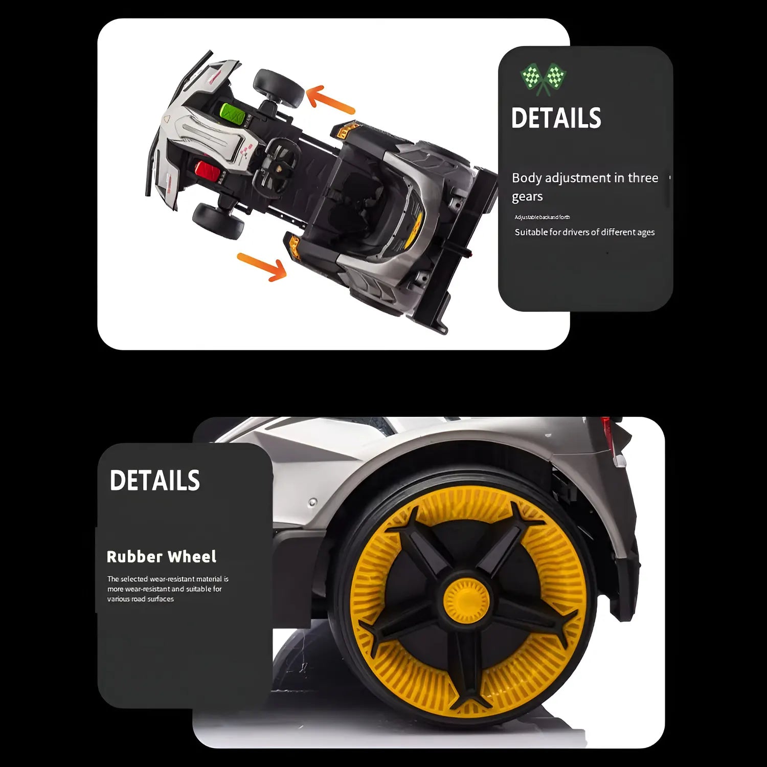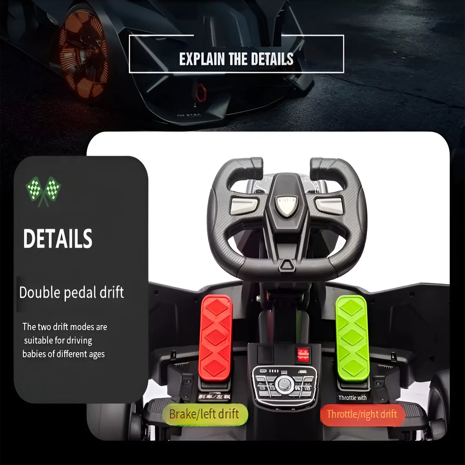 - Safety Features: Seat belts, secure steering, non-slip pedals